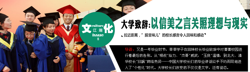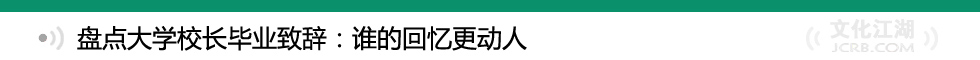 “我們一起在BBS‘冒泡’‘灌水’,一起看《交大那些事》,一同撥過‘餓了么’的外賣電話……”——被稱為“杰哥”的上海交通大學校長張杰 “很可能復旦給你們的這些貌似無用的東西,恰恰是最神圣、最珍貴的精神價值。它將滿足人心靈的需要,它將注入你們在座每一位的終生!薄獜偷┐髮W校長楊玉良 人間正道是滄桑,在2052年百年校慶之日,怎樣的文字將鐫刻其上?你們和我們,是麻木?還是吶喊?是沉淪?還是奮起?——中國政法大學2011屆研究生畢業致辭 “多年以后,你們來,或者不來,母校就在這里,不舍不棄;見、或者不見,我們的心永在一起,不分不離。” ——廣外校長仲偉合 “那就把幾句清涼的話語,說給燥熱的你:你可能繼續學習,但當清楚這到底是手段,還是目的。一個人應當快學習,但不應該學習學習再學習,最后聰明地死去! ——成都理工大學文法學院院長陳俊明2011屆畢業致辭《業,畢了沒?》 “你們必須用你們過人的智慧和思辨的精神去提升政治決策的水平。你們必須以公民的身份響應時代的號召”!斝iL理查德·查·萊文在2010年畢業致辭《重塑政治》
