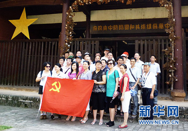 今年是中國共產黨建黨90周年,紅色旅游人數遠遠超過去年同期。這是游客在瑞金中華蘇維埃臨時中央政府舊址前合影。新華網發(徐春來 攝)