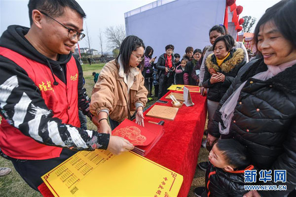 1月5日,工作人員在游園會活動現(xiàn)場為群眾印制分發(fā)新春年歷。當(dāng)日,浙江省杭州市余杭區(qū)塘棲村舉辦迎新春“幸福游園會”,內(nèi)容包括重現(xiàn)不同年代結(jié)婚場景、慶豐收甘蔗運動會、傳統(tǒng)美食制作、趣味游戲等,讓當(dāng)?shù)匕傩赵谛腋g樂的氣氛中迎接即將到來的新春佳節(jié),同時也感受家鄉(xiāng)發(fā)展帶來的新變化。
