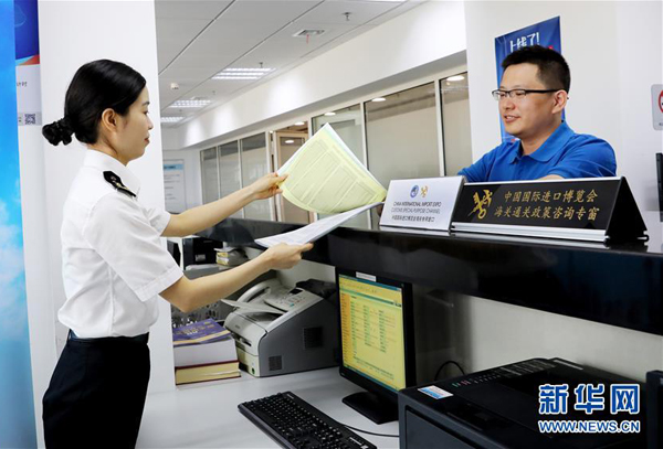 9月26日,海關(guān)工作人員接收?qǐng)?bào)關(guān)公司辦事員遞交的依維柯貨車(chē)展品的報(bào)關(guān)材料。當(dāng)日,一輛由意大利拉斯佩齊亞港裝船,經(jīng)海路運(yùn)抵上海洋山港的依維柯貨車(chē),在上海會(huì)展中心海關(guān)通過(guò)ATA單證冊(cè)方式完成報(bào)關(guān)手續(xù),成為第二屆中國(guó)國(guó)際進(jìn)口博覽會(huì)首票通關(guān)展品。據(jù)統(tǒng)計(jì),目前已有來(lái)自150多個(gè)國(guó)家和地區(qū)的3000多家企業(yè)報(bào)名參展第二屆進(jìn)博會(huì),相關(guān)商業(yè)展規(guī)模達(dá)30多萬(wàn)平方米。