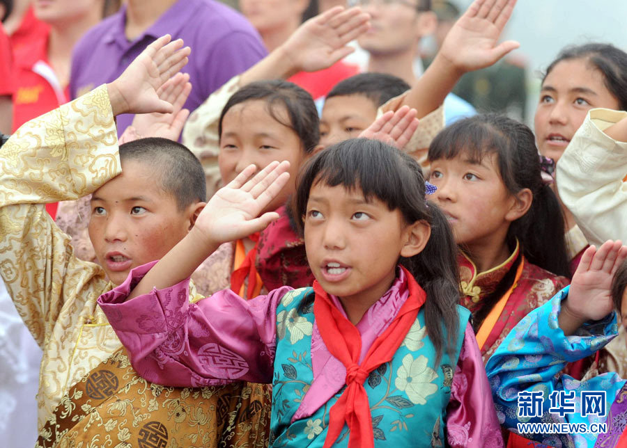7月1日,來自西藏山南地區乃東縣中學的師生在天安門廣場參加升旗儀式。當日,來自全國各地的數萬名群眾匯聚北京天安門廣場,觀看隆重的升旗儀式,紀念中國共產黨成立90周年。 新華社記者 羅曉光 攝