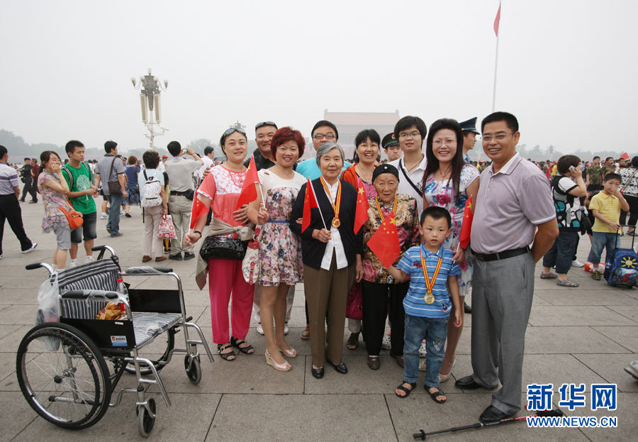 7月1日,五世同堂的楊明聰(前排左四)一家人在天安門廣場前合影留念。當日,來自全國各地的數萬名群眾匯聚北京天安門廣場,觀看隆重的升旗儀式,紀念中國共產黨成立90周年。 新華社發(萬象 攝)