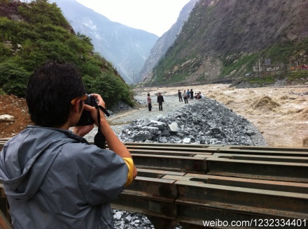 記者在國道213垮塌現(xiàn)場拍攝,現(xiàn)場滾石聲隆。ㄈA西都市報記者 李逢春 攝)