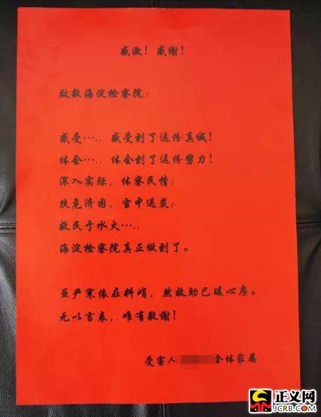 宣布會現場,被害人子女接過20萬救助金時,激動地對在場檢察官說:“我們沒有想到檢察官會主動跟我們提司法救助的事,更沒想到你們能救助我們這么及時和有力。我母親受傷后,家人心理上受到很大煎熬,現在每個月的醫療費都要十萬元,我們也試著尋求其他救助,但是程序繁瑣、幫助有限。最終是在檢察院我們切實地感受到了你們是真心想幫助我們……”隨后他們拿出精心準備的感謝信,一字一句讀出來:“海淀檢察院深入實際、體察民情;扶危濟困、雪中送炭……”
