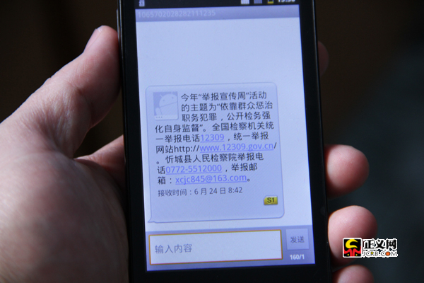 忻城縣檢察院“舉報宣傳周”活動的宣傳短信內(nèi)容。黃啟平 攝