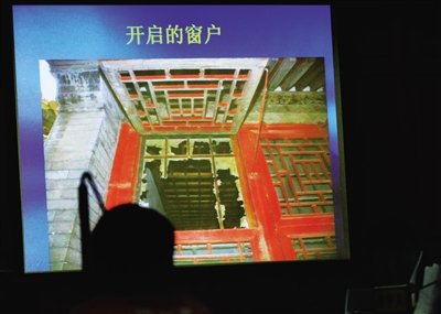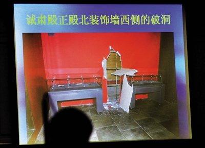 進(jìn)入誠(chéng)肅殿內(nèi)后,石柏魁摸索到一面墻。敲擊感覺(jué)不是石墻,于是手腳并用扒開(kāi)一個(gè)破洞,從洞口鉆進(jìn)事發(fā)現(xiàn)場(chǎng)的展廳。