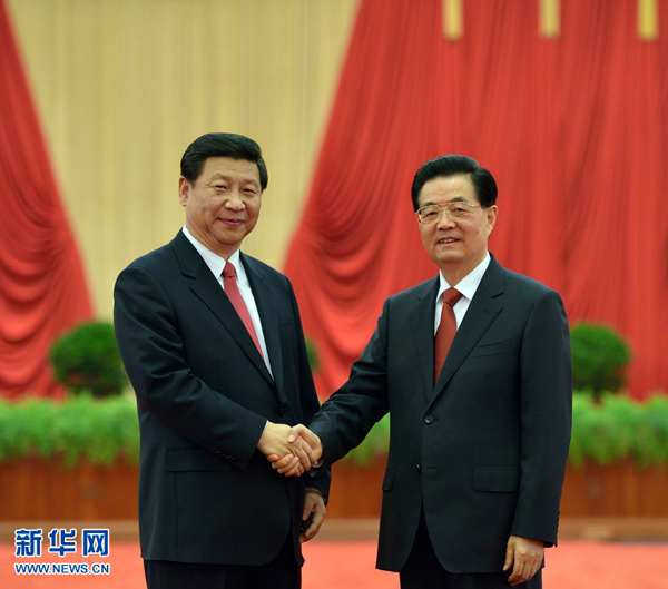 11月15日,國家主席胡錦濤,新當選的中共中央總書記、中共中央軍委主席習近平等領導同志在北京人民大會堂親切會見出席黨的十八大代表、特邀代表和列席人員并發表重要講話。這是胡錦濤和習近平親切握手。新華社發