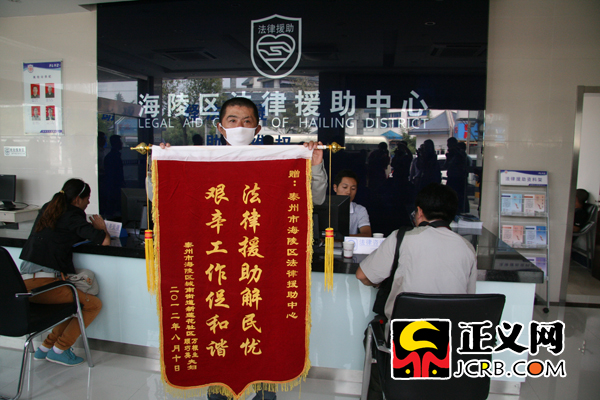 泰州市海陵區居民萬根生通過法律援助維護了自己的權益,送錦旗致謝。朱晶 攝