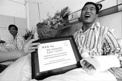 昨天,在解放軍411醫院內科大樓11樓的手外科病房26號病床上,周傳金領到了上海市見義勇為評審委員會為他頒發的“上海市見義勇為先進分子”證書。昨天傍晚,周母從安徽趕到上海看望兒子。小周所在的公司也聘其為終身員工。