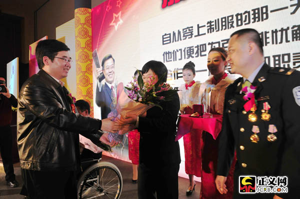 2011年度正義人物打拐英雄陳士渠為2012年度正義人物馬俊欣、陳遼敏、馮暉頒獎。閆昭 攝