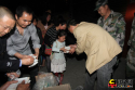 4月20日晚9時,四川邛崍市檢察院干警正向緊鄰 “4.20”蘆山7.0級地震震中的該市高何鎮靖口村的受災群眾和參與搶險救災的干部、民兵、志愿者分發送去的盒飯。王弈 攝