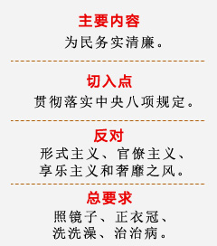 | 歷時一年多的教育實踐活動,針對形式主義、官僚主義、享樂主義和奢靡之風,解決了一些多年想解決沒有解決的問題,剎住了許多人認為“不可能剎住”的歪風,取得實實在在的成效。 |