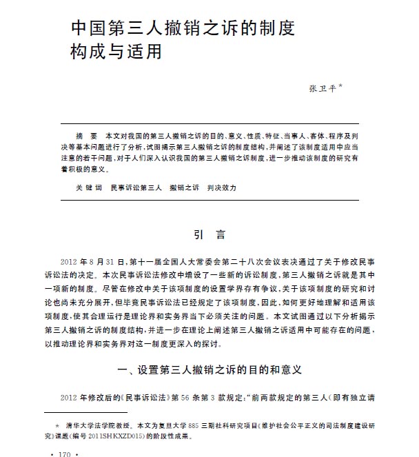 《中國第三人撤銷之訴的制度構成與適用》,張衛平,載《中外法學》2013年第1期。
