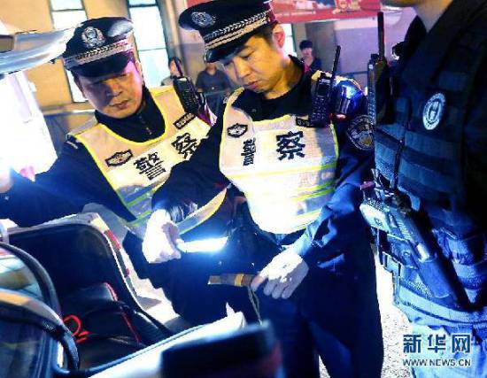 4月28日凌晨,公安民警在對可疑車輛進行排查時搜出管制刀具。新華社記者 陳飛 攝