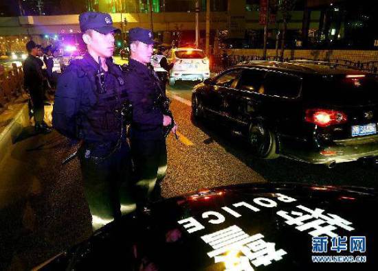 4月28日凌晨,上海市普陀區公安特警在街上排查可疑車輛。新華社記者 陳飛 攝