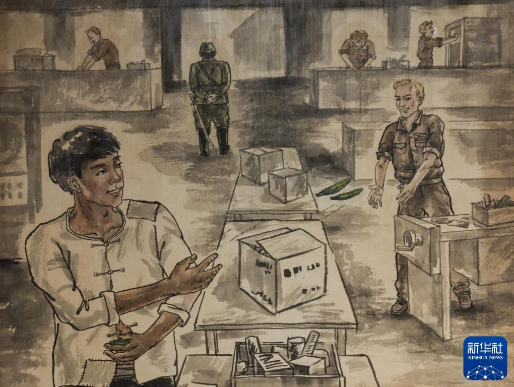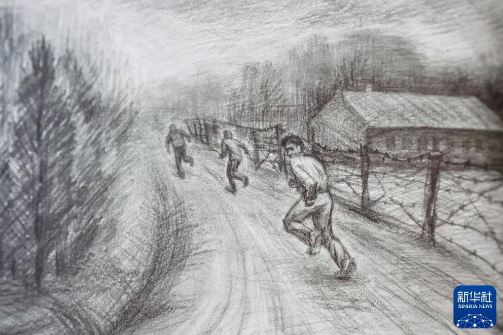 沈陽(yáng)二戰(zhàn)盟軍戰(zhàn)俘營(yíng)舊址陳列館內(nèi)展出的繪畫作品(翻拍照片)。