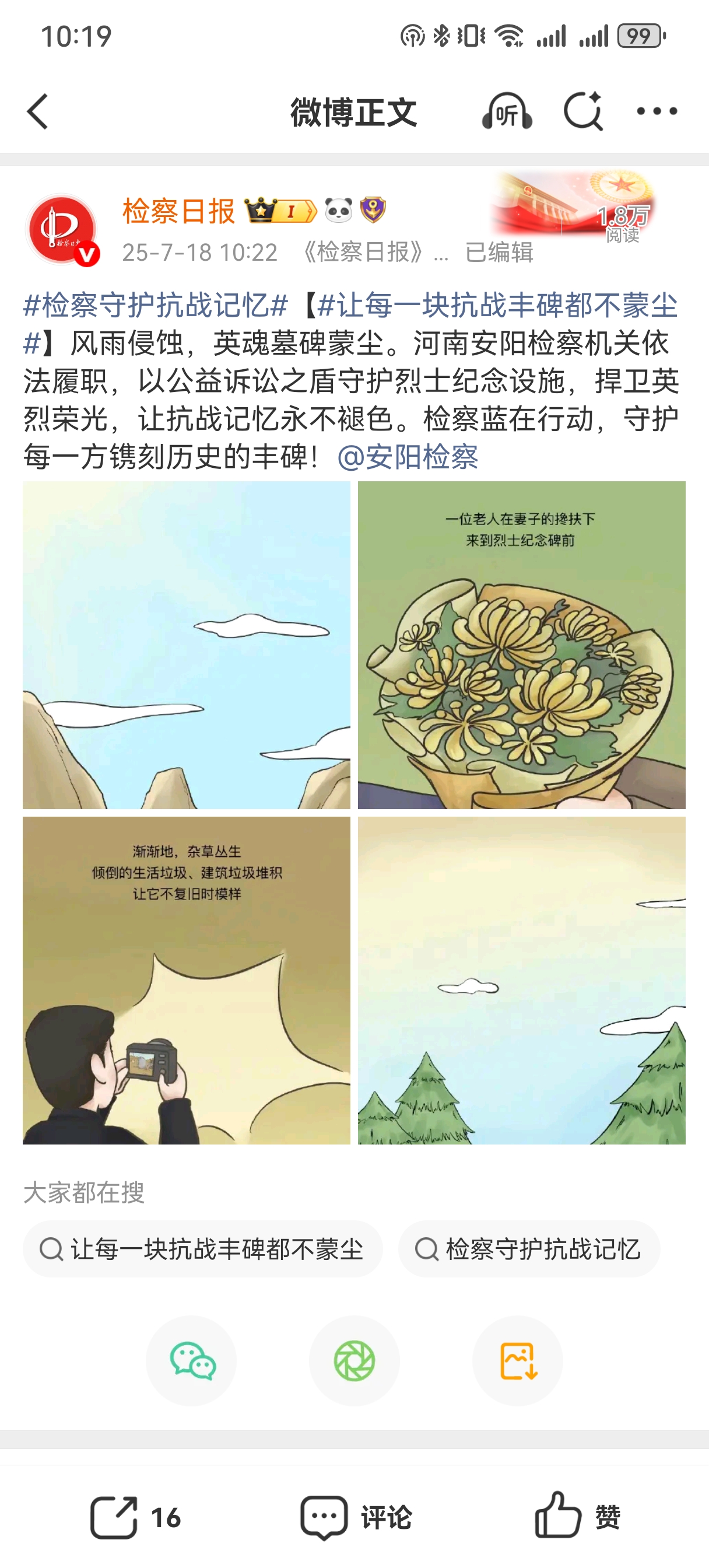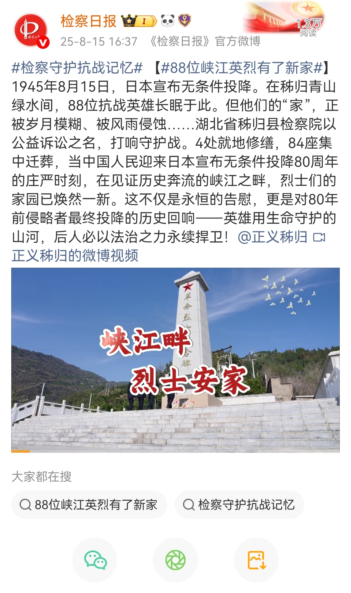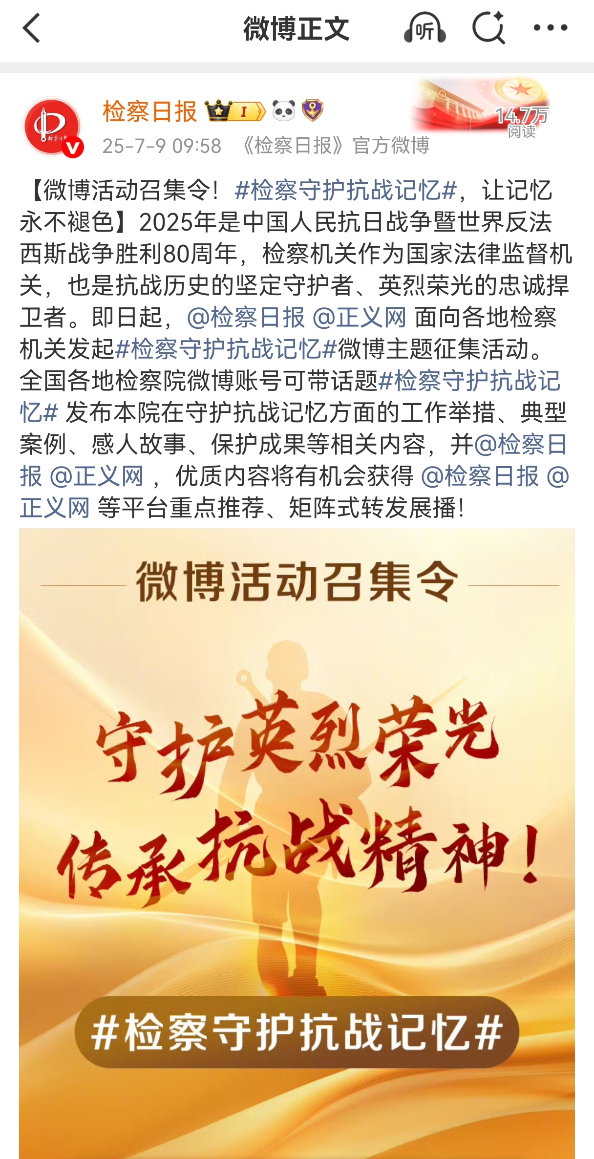 八十年歲月鎏金,八十年精神永續。當時光的指針走向中國人民抗日戰爭暨世界反法西斯戰爭勝利80周年之際,那段山河浴血、眾志成城的壯闊史詩,依然在時光長河中激蕩著震撼人心的力量。回望烽火,聚焦當下,檢察日報正義網推出大型融媒體專題,記錄那些銘記抗戰歷史、守護抗戰記憶、傳承抗戰精神的檢察身影和法治足跡。