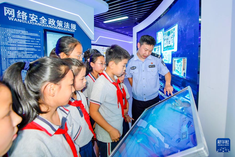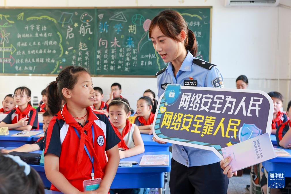 9月15日,在江蘇省泰興市襟江小學教育集團佳源校區,泰興市公安局城北派出所民警通過互動方式在給學生講解網絡安全知識。