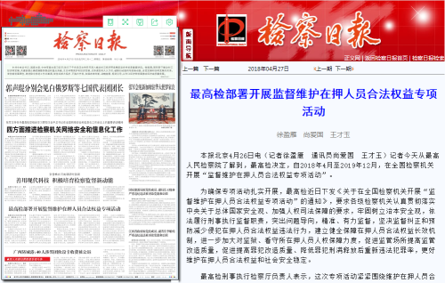 最高檢決定,自2018年4月至2019年12月,在全國檢察機關開展“監督維護在押人員合法權益專項活動”。為確保專項活動扎實開展,最高檢下發《關于在全國檢察機關開展“監督維護在押人員合法權益專項活動”的通知》,要求各級檢察機關認真貫徹落實中央關于總體國家安全觀、加強人權司法保障的要求,牢固樹立治本安全觀,依法履行刑事執行監督職責,突出問題導向,精準、有力監督,堅決監督糾正和預防減少侵犯在押人員合法權益違法行為,建立健全保障在押人員合法權益長效機制,進一步加大對監獄、看守所在押人員人權保障力度,促進監管場所提高監管改造質量,促進提高罪犯改造質量、降低罪犯刑滿釋放后重新違法犯罪率,更好維護在押人員合法權益和社會安全穩定。