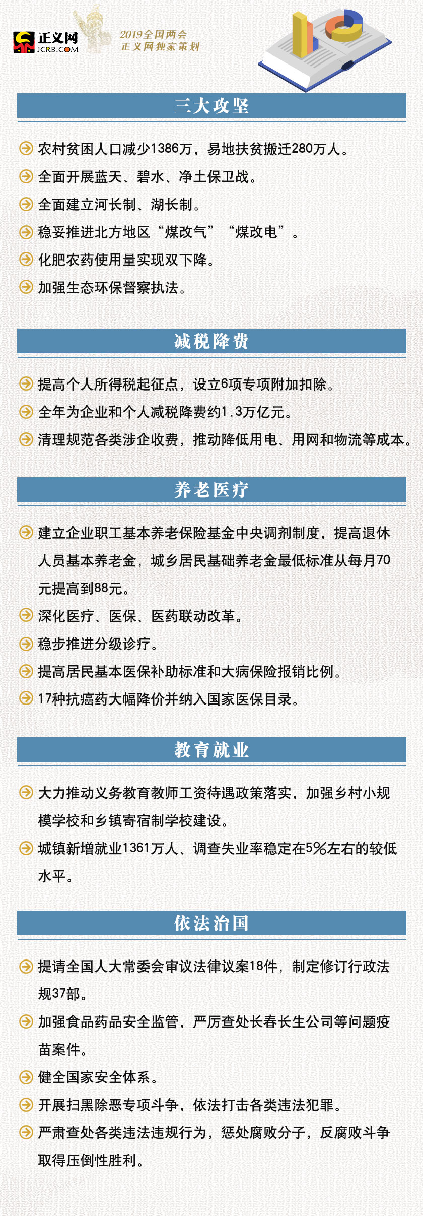 2019年3月5日,國務院總理李克強在十三屆全國人大二次會議上作政府工作報告。回顧2018,依法治國、三大攻堅、減稅降費、養老醫療……政府為保障民生,做了諸多工作。翹首2019,政府在民生領域,又將有哪些新動作?民生事關你我,且看政府如何發力↓↓