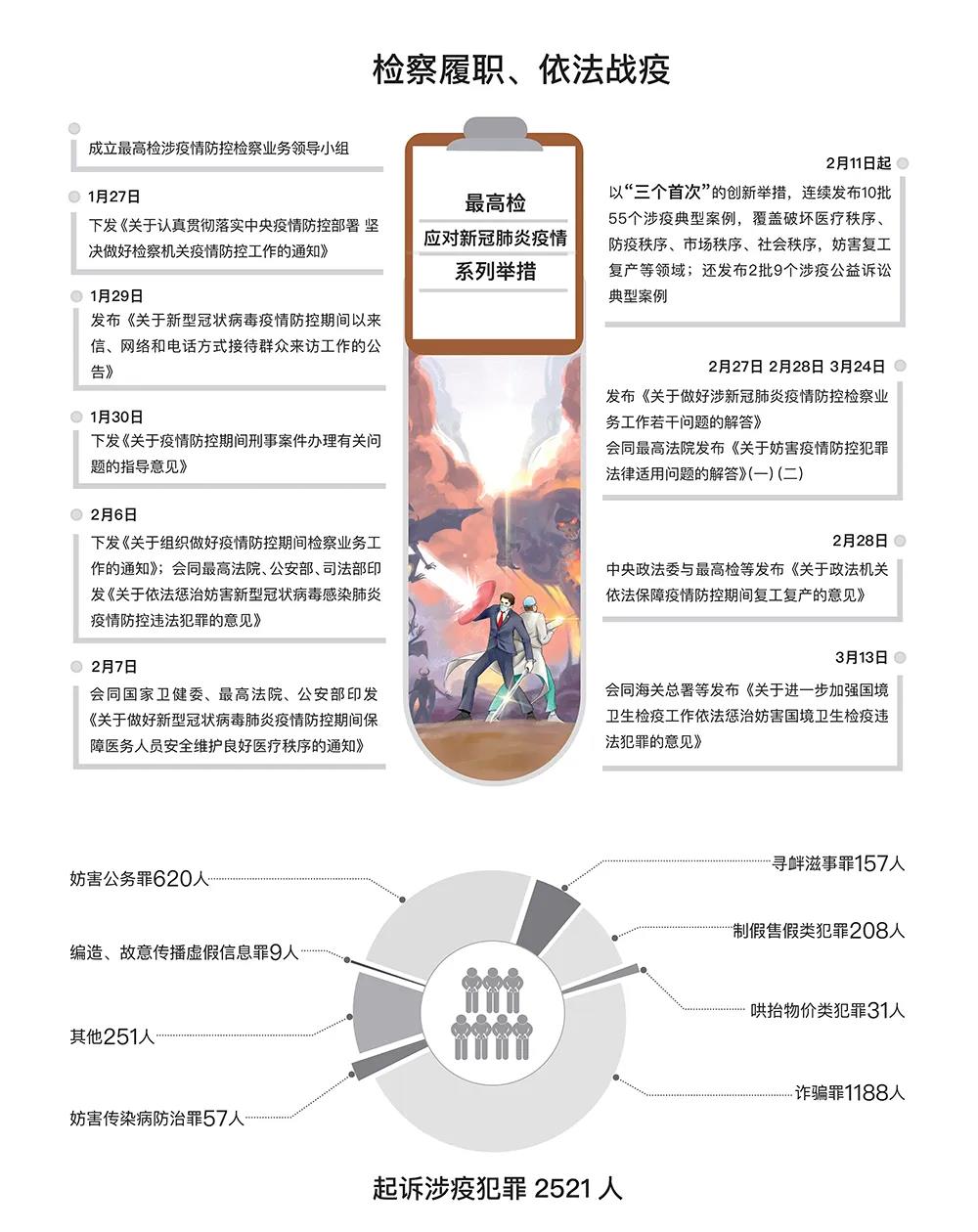 最高人民檢察院堅(jiān)決貫徹習(xí)近平總書記重要指示和黨中央決策部署,帶領(lǐng)各級(jí)檢察機(jī)關(guān)主動(dòng)服務(wù)疫情防控大局,在依法戰(zhàn)疫中守初心、擔(dān)使命。2020年2月至4月,共批準(zhǔn)逮捕涉疫刑事犯罪3751人、起訴2521人,辦理涉口罩等防護(hù)物資監(jiān)管、醫(yī)療廢棄物處置、野生動(dòng)物保護(hù)等領(lǐng)域公益訴訟案件2829件。一是迅速出臺(tái)辦案規(guī)范。疫情突如其來(lái),依法防控更顯重要。為適應(yīng)辦案需要,最高人民檢察院1月30日出臺(tái)專門規(guī)范。其后,會(huì)同相關(guān)政法部門發(fā)布指導(dǎo)意見(jiàn),依法懲治危害疫情防控犯罪;與國(guó)家衛(wèi)健委等作出部署,對(duì)傷醫(yī)擾醫(yī)犯罪一律從嚴(yán)追訴;與海關(guān)總署等共同規(guī)范懲治妨害國(guó)境衛(wèi)生檢疫犯罪,嚴(yán)防疫情境外輸入性風(fēng)險(xiǎn);與相關(guān)領(lǐng)導(dǎo)機(jī)關(guān)、政法部門共同發(fā)布指導(dǎo)意見(jiàn),助力復(fù)工復(fù)產(chǎn),促進(jìn)加快恢復(fù)經(jīng)濟(jì)社會(huì)秩序。二是創(chuàng)新以案釋法。應(yīng)對(duì)重大突發(fā)公共衛(wèi)生事件不能按部就班。自2月11日起,最高人民檢察院首次以在辦的批捕起訴案件釋法,首次會(huì)同公安部發(fā)布典型案例,首次以每周一批的頻次,根據(jù)疫情防控不同階段特點(diǎn),分專題發(fā)布10批55個(gè)典型案例,突出維護(hù)醫(yī)療秩序、防疫秩序、市場(chǎng)秩序、社會(huì)秩序,收到規(guī)范司法、警示犯罪、教育社會(huì)的積極效果。三是保障涉案人合法權(quán)益。從一開(kāi)始就注意準(zhǔn)確把握法律政策,力防突破法律的“從重”“從嚴(yán)”“從快”。犯罪嫌疑人是確診或疑似患者的,首先保障救治,體現(xiàn)司法人文關(guān)懷。對(duì)情節(jié)輕微的涉疫犯罪落實(shí)從寬政策,依法不批捕576人、不起訴117人。在這場(chǎng)嚴(yán)峻斗爭(zhēng)中,各地特別是湖北檢察機(jī)關(guān)聞令而動(dòng),堅(jiān)持自身防疫與依法履職兩手抓,下沉社區(qū)參與一線聯(lián)防聯(lián)控,以法與情寫就中國(guó)抗疫故事檢察篇章。經(jīng)歷這次大考,我們更加深刻感受到中國(guó)共產(chǎn)黨領(lǐng)導(dǎo)和我國(guó)社會(huì)主義制度的顯著優(yōu)勢(shì),更加深刻體會(huì)到法治在國(guó)家治理中的重要作用。