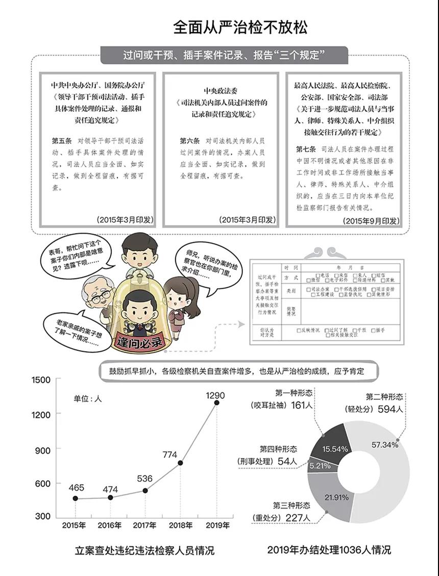 堅(jiān)持全面從嚴(yán)治檢。過(guò)問(wèn)或干預(yù)、插手司法辦案等重大事項(xiàng)須記錄報(bào)告,中央和有關(guān)部門早有“三個(gè)規(guī)定”。“過(guò)問(wèn)”主要是陳述情況、了解進(jìn)展,多為監(jiān)督公正司法;“記錄、報(bào)告”有利約束檢察官,防止人情案、關(guān)系案、金錢案。面對(duì)多數(shù)不實(shí)的“零報(bào)告”,最高人民檢察院以上率下,要求“逢問(wèn)必錄”,不讓“零報(bào)告”架空好規(guī)定。四級(jí)檢察院全員覆蓋、逐月報(bào)告,共記錄報(bào)告2018年以來(lái)有關(guān)事項(xiàng)18751件。自覺(jué)接受各級(jí)紀(jì)委監(jiān)委及派駐紀(jì)檢監(jiān)察組監(jiān)督,以刮骨療毒的勇氣減存量、遏增量,包括最高人民檢察院機(jī)關(guān)和事業(yè)單位6人在內(nèi)的1290名檢察人員因違紀(jì)違法被立案查處,同比上升66.7%,54人被追究刑事責(zé)任。堅(jiān)持刀刃向內(nèi),從嚴(yán)查處為黑惡勢(shì)力站臺(tái)撐腰的檢察人員42人。堅(jiān)持實(shí)事求是,對(duì)嚴(yán)抓嚴(yán)管查處更多案件的給予肯定,鼓勵(lì)抓早抓小,把管黨治黨主體責(zé)任落實(shí)。