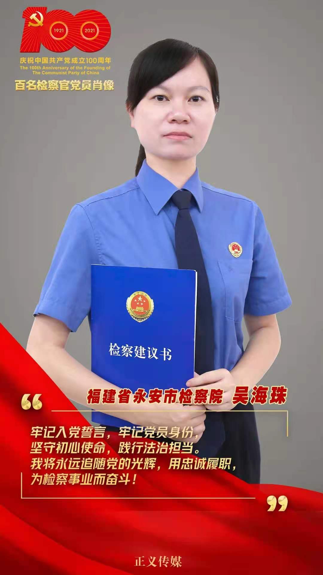 吳海珠,福建省永安市檢察院第五檢察部一級檢察官,年齡35歲,黨齡14年。