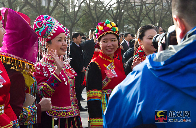 3月5日上午,第十二屆全國人民代表大會第四次會議在人民大會堂開幕,國務(wù)院總理李克強(qiáng)作政府工作報告,審查計劃報告和預(yù)算報告。廣西代表團(tuán)代表著盛裝出席會議。正義網(wǎng)記者程丁攝