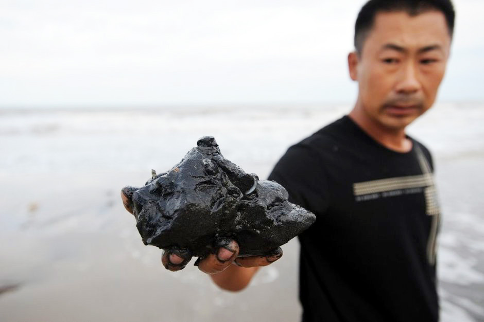 樂(lè)亭縣養(yǎng)殖戶舉起疑為溢油所形成的黑色凝結(jié)物。資料圖片
