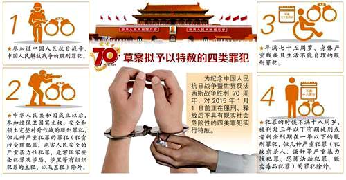 為紀念中國人民抗日戰爭暨世界反法西斯戰爭勝利70周年,全國人大常委會審議通過了關于特赦部分服刑罪犯的決定。百度圖片