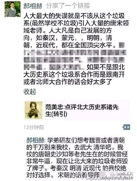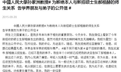 2015年9月20日,中國人民大學歷史學院教授孫家洲發布一封公開信,信中申明要斷絕與新招碩士生郝相赫的師生關系。事件源于之前郝相赫同學曾在自己的微信朋友圈轉發一則點評北京大學歷史系學者的文章,并加以點評曰:“人大最大的失誤就是不該從這個垃圾系引入大量的唐宋領域老師……如果不是跟北大歷史系這個垃圾系合作而是跟南開或者北師大合作的話好太多。”并將北京大學閻步克教授、中國人民大學韓樹峰老師與澳門學者李憑先生比較,說前兩者“平庸”。