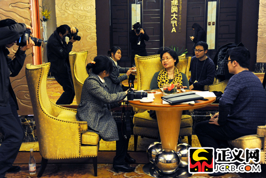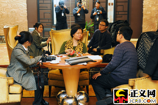 2012年3月12日,湖北代表團代表呂忠梅在審議兩高報告時接受記者采訪。當日,出席十一屆全國人民代表大會第五次會議各代表團審議兩高報告。 正義網記者 肖杰/攝