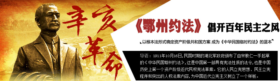 1911年10月28日,宋教仁與黃興一同抵達武漢。此時清軍逼近,漢口危在旦夕,黃興一心所系是打退清兵,先立戰功,再作其他打算;而宋教仁的著眼點則在“立”,他力主組織中央臨時軍政府,以取得交戰團的合法地位。一番努力沒有成功,宋教仁便轉向以建設新國家為宗旨的立法活動,以其精湛的法學知識及長期充分的積累準備,在短短的時間之內起草了《中華民國鄂州臨時約法》(簡稱《鄂州約法》)。