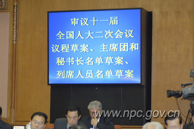 2月25日下午,十一屆全國人大常委會第七次會議舉行第一次全體會議,審議十一屆全國人大二次會議議程草案、主席團和秘書長名單草案、列席人員名單草案。中國人大網(wǎng) 王新慶攝