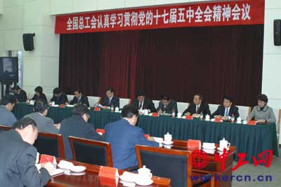 全國總工會10月20日上午召開認真學習貫徹黨的十七屆五中全會精神會議。中共中央政治局委員、全國人大常委會副委員長、中華全國總工會主席王兆國出席會議并發表重要講話,全總黨組書記、副主席、書記處第一書記王玉普主持會議。