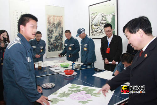 正義網記者與三門峽市檢察院駐硤石監獄檢察室相關負責人觀看服刑人員藝術作品。姚宇/攝